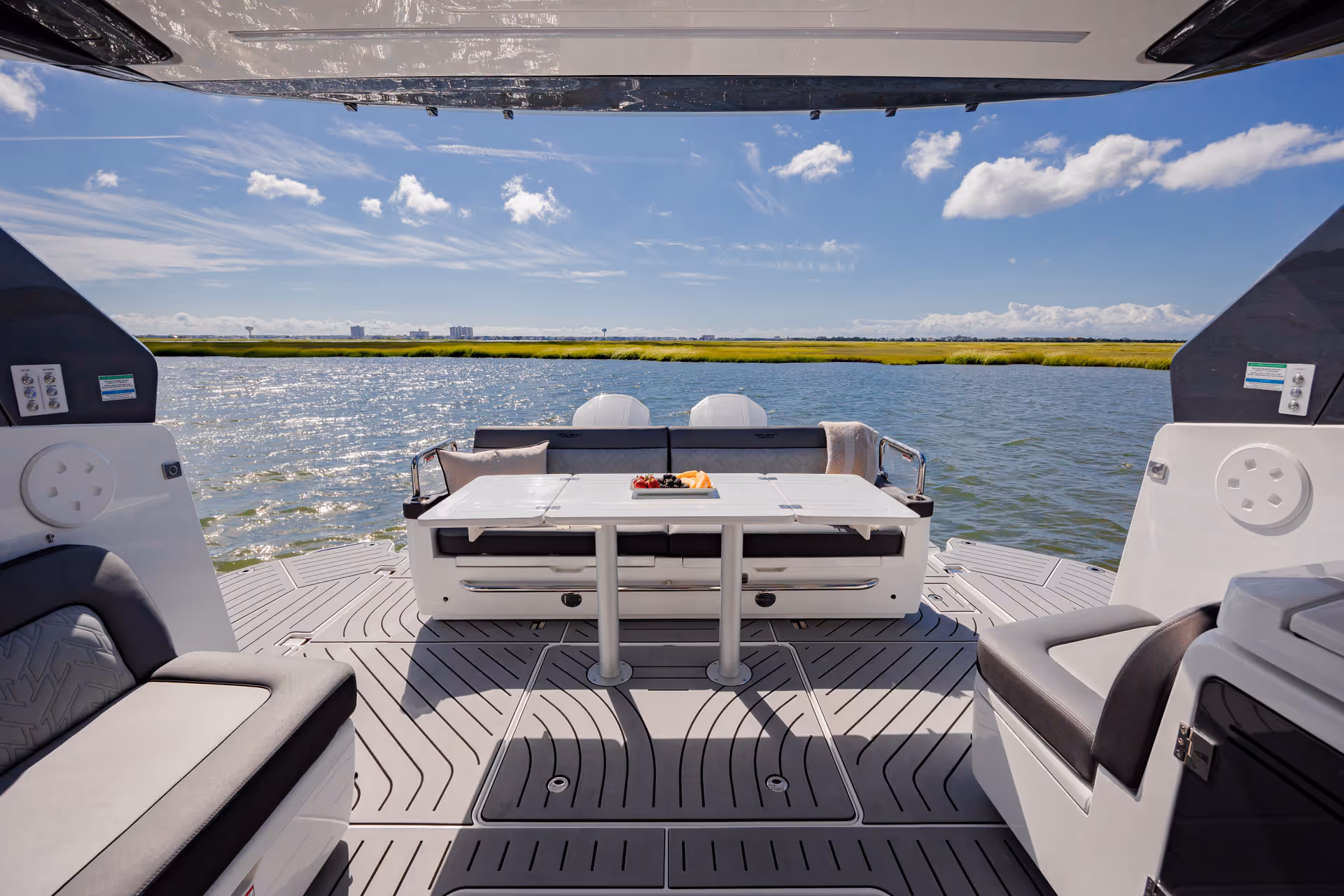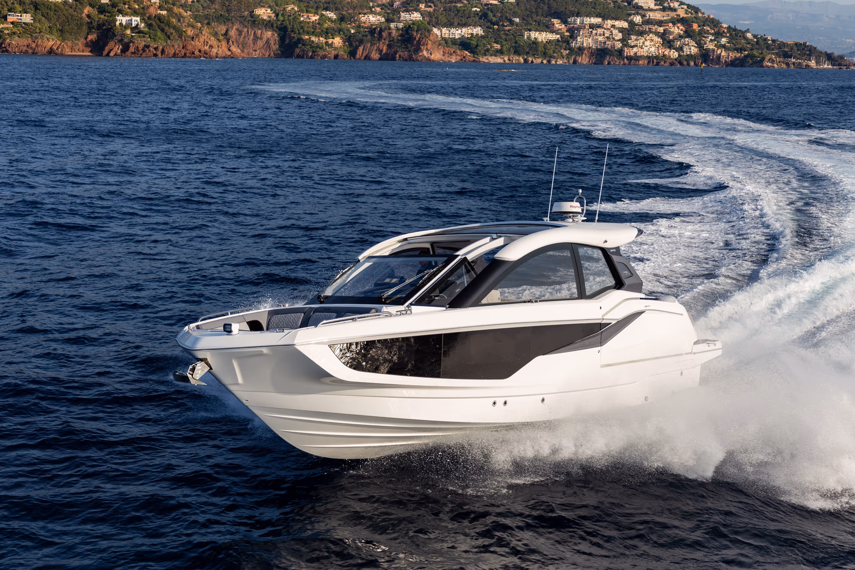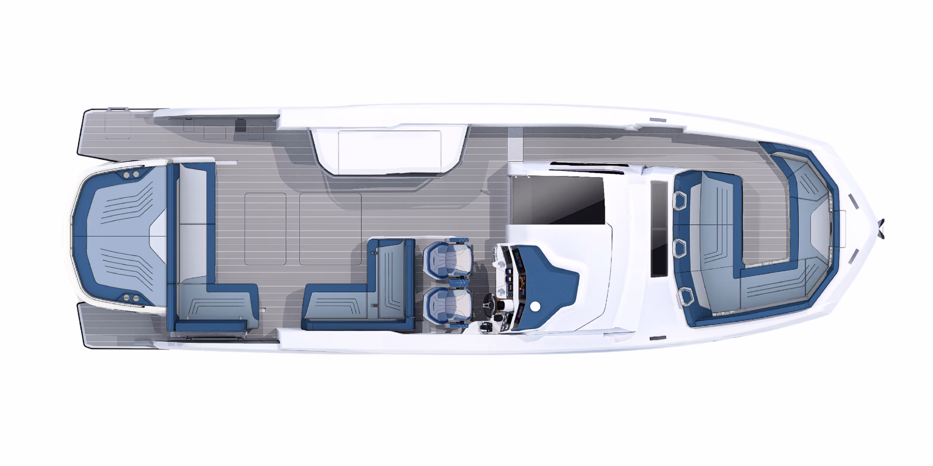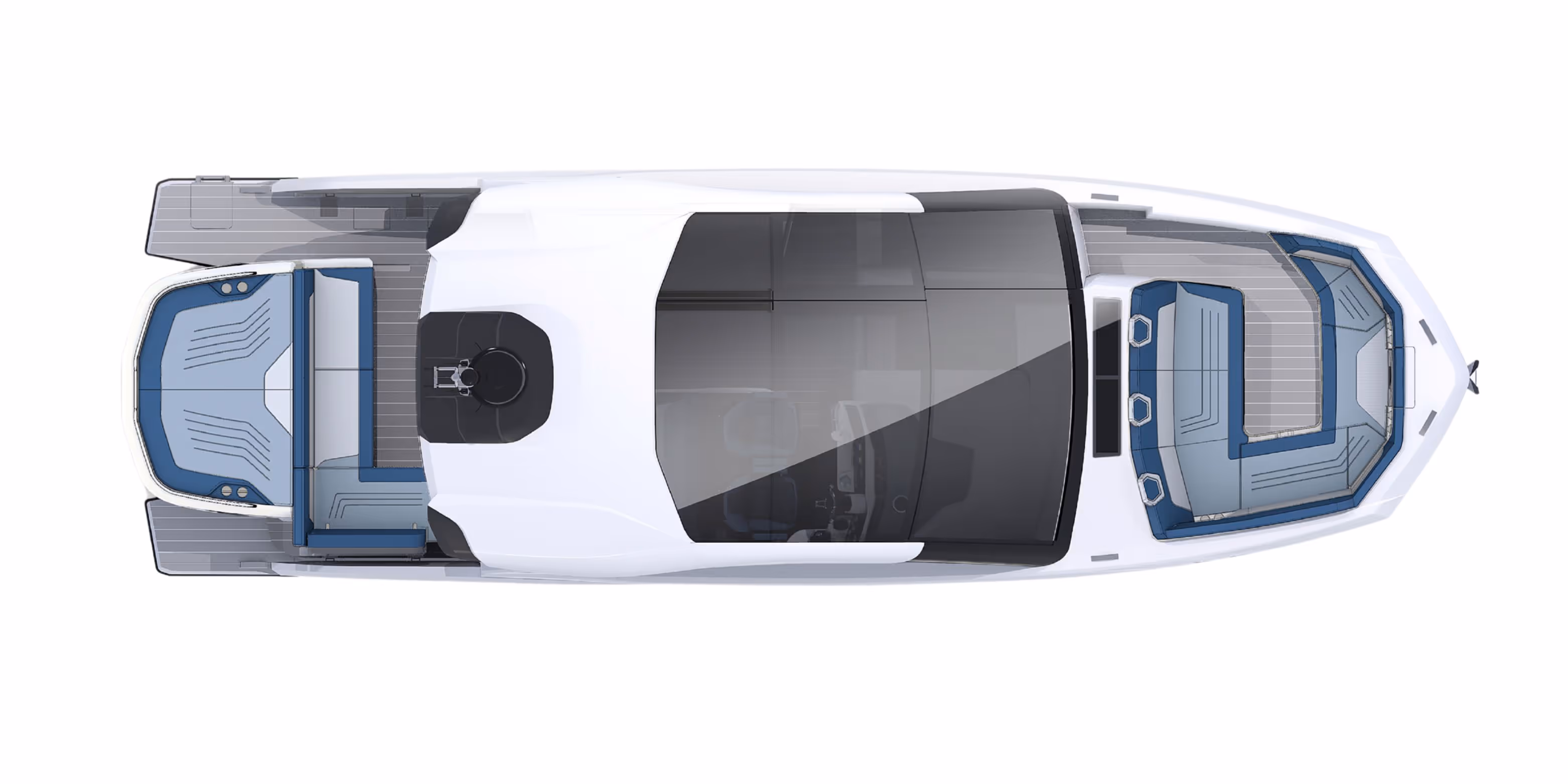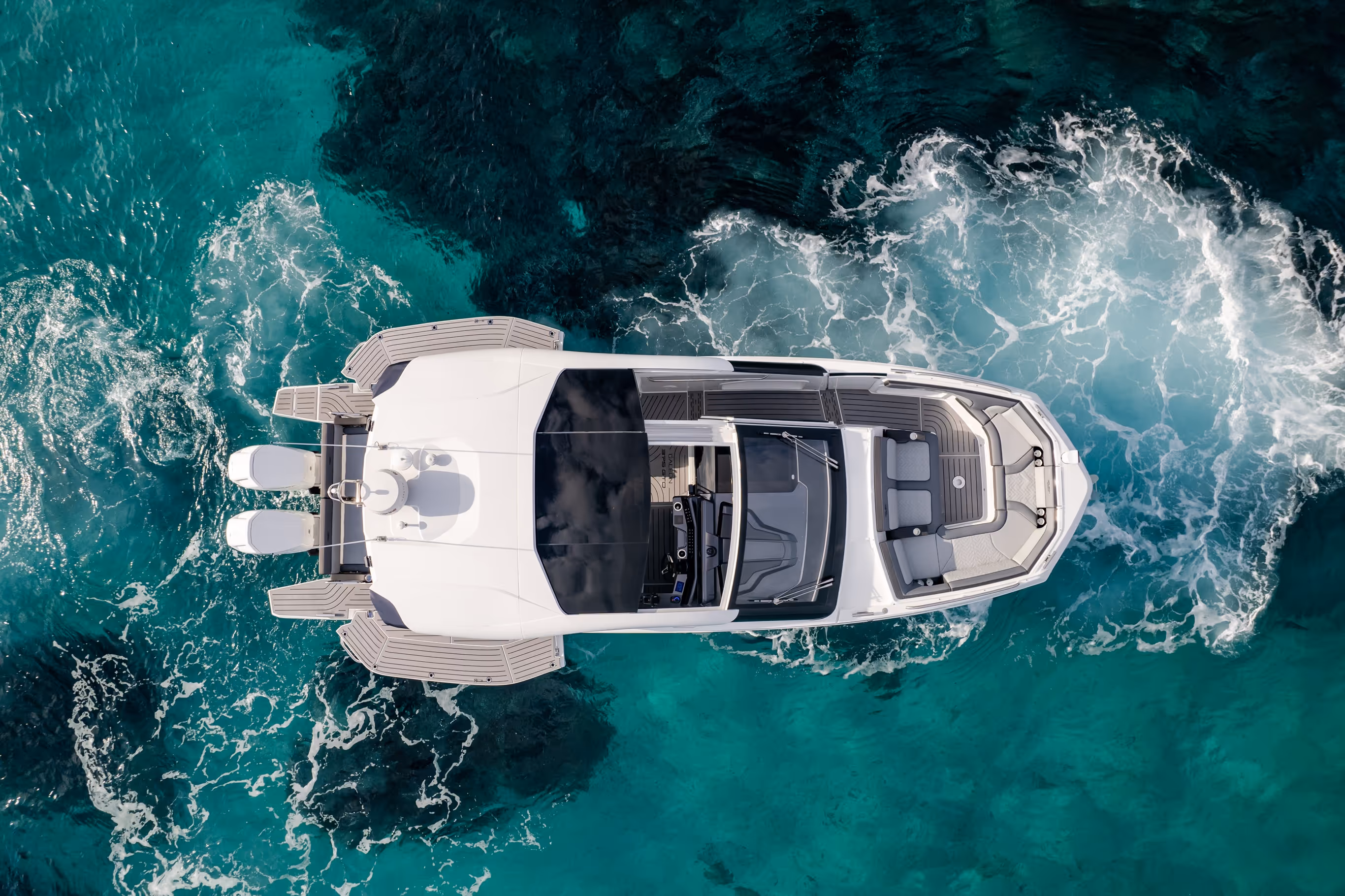 Das versenkbare Schiebedach über dem Steuerstand, die vollständig zu öffnenden Seitenfenster und das bündig umlaufende Deck bieten eine nahtlose Verbindung mit der Außenwelt. Am Bug verwandelt sich eine geräumige Lounge mit Nackenstütze in eine luxuriöse Sonnenliege. Im Cockpit sorgen ausklappbare Balkone, flexible Sitzgelegenheiten und mehrere Heckspiegeloptionen - Freizeit, Sitzbank oder Angelversion mit Lebendfässern und Rutenhaltern - für unübertroffene Vielseitigkeit und Komfort.