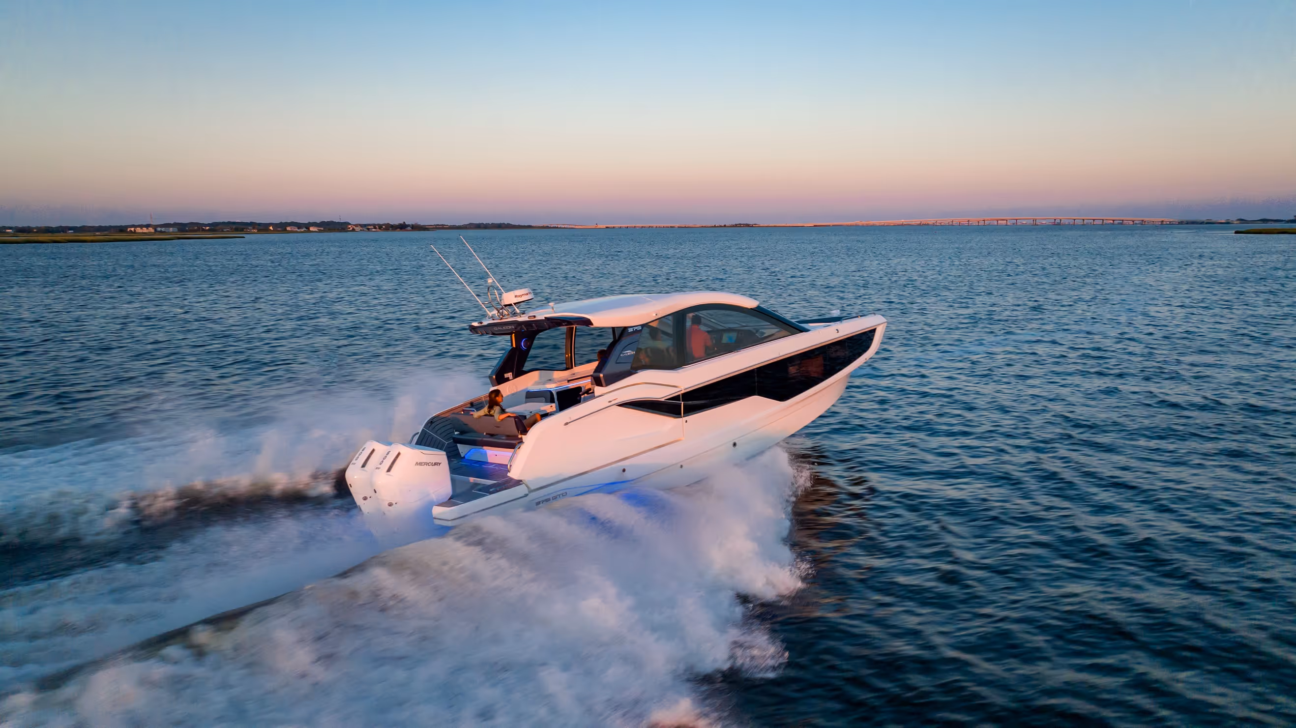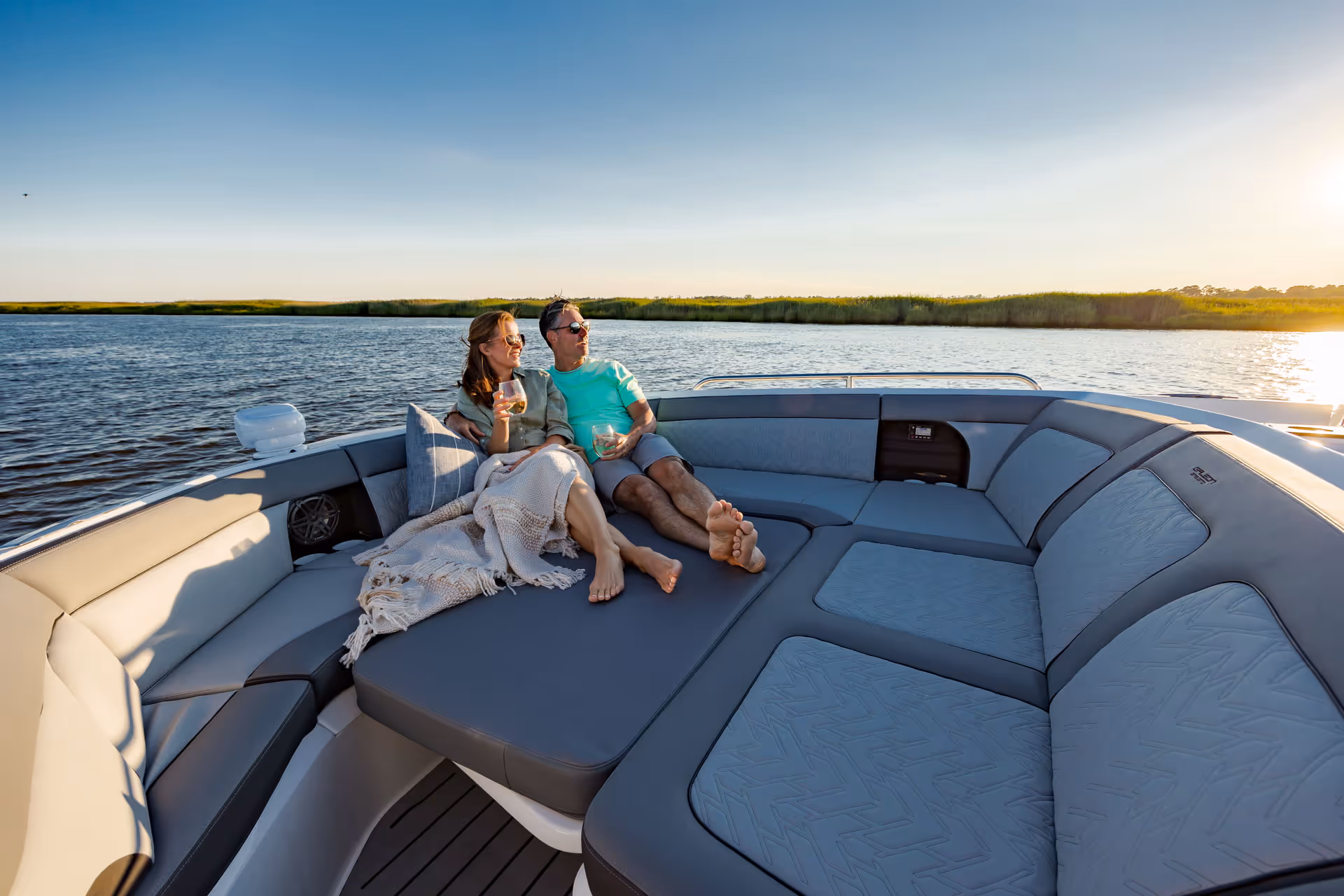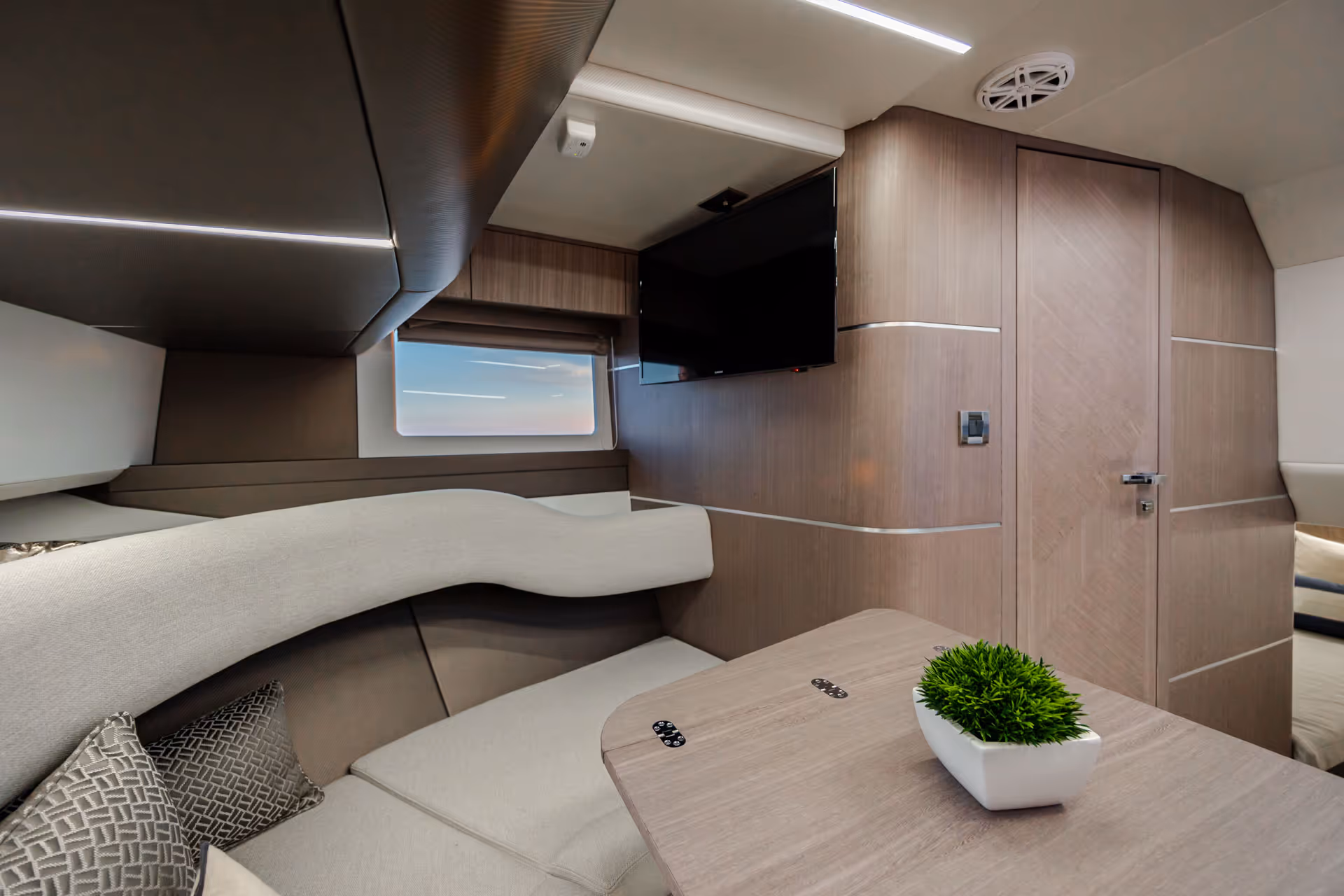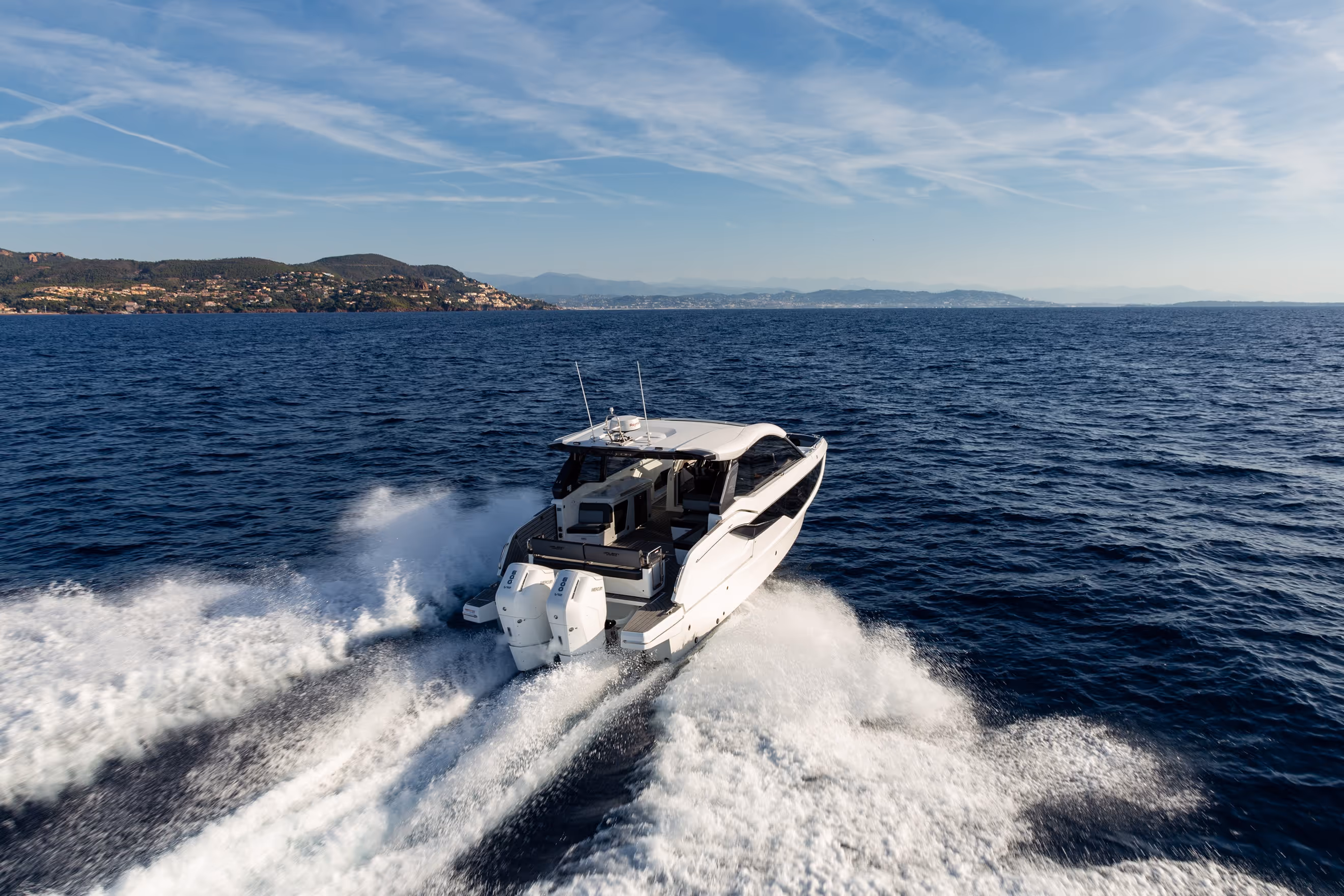 Das versenkbare Schiebedach über dem Steuerstand, die vollständig zu öffnenden Seitenfenster und das bündig umlaufende Deck bieten eine nahtlose Verbindung mit der Außenwelt. Am Bug verwandelt sich eine geräumige Lounge mit Nackenstütze in eine luxuriöse Sonnenliege. Im Cockpit sorgen ausklappbare Balkone, flexible Sitzgelegenheiten und mehrere Heckspiegeloptionen - Freizeit, Sitzbank oder Angelversion mit Lebendfässern und Rutenhaltern - für unübertroffene Vielseitigkeit und Komfort.