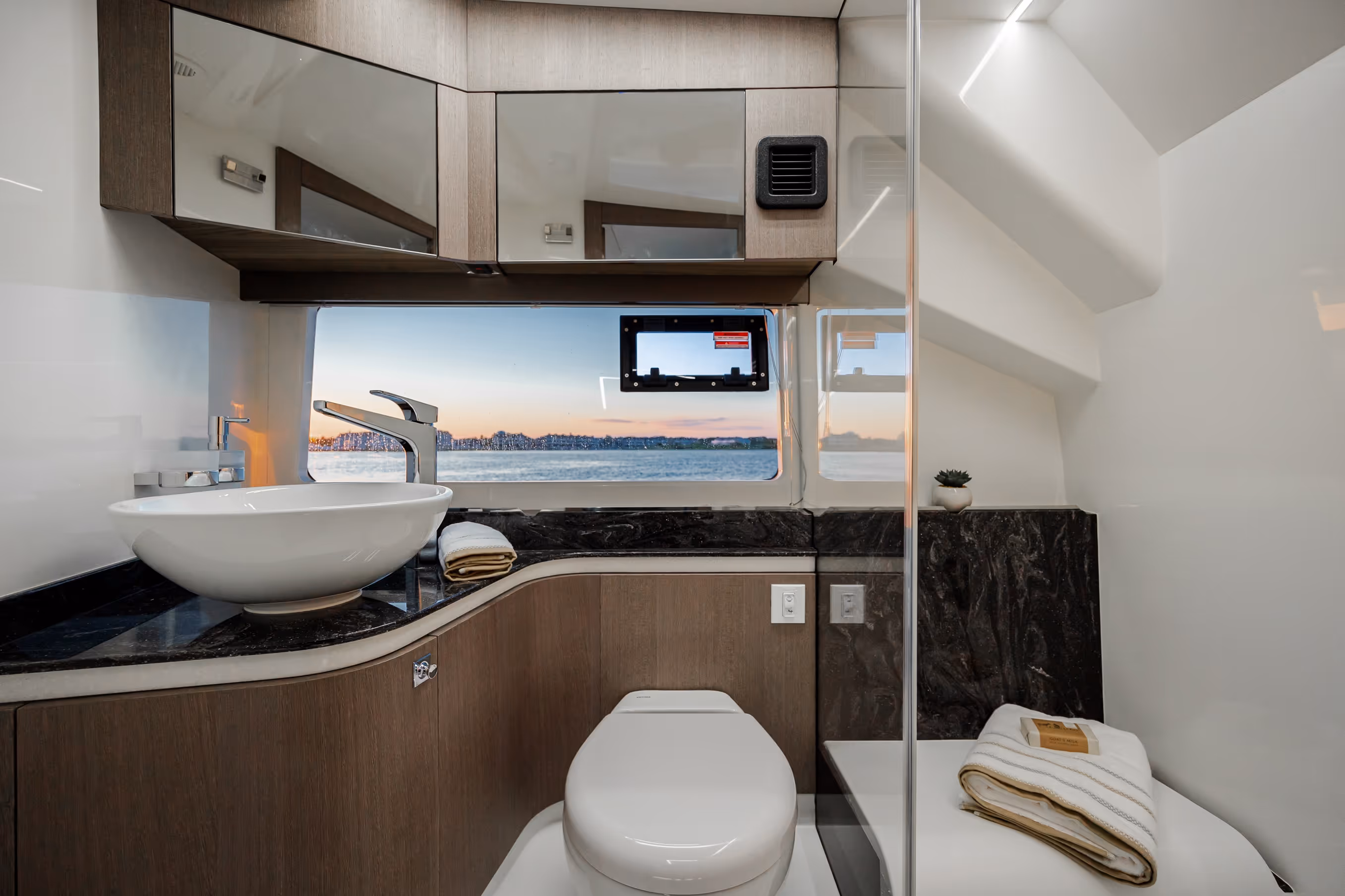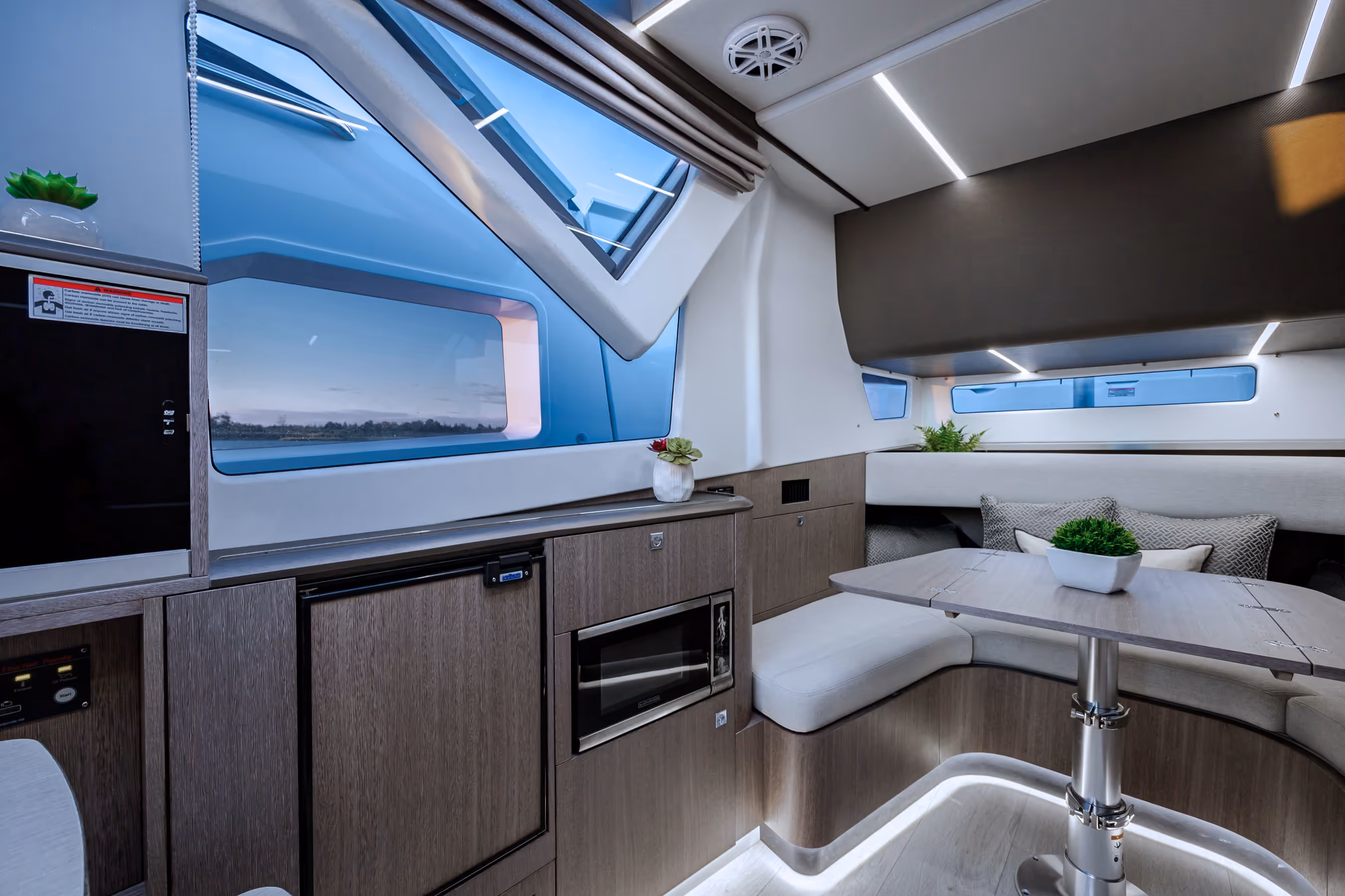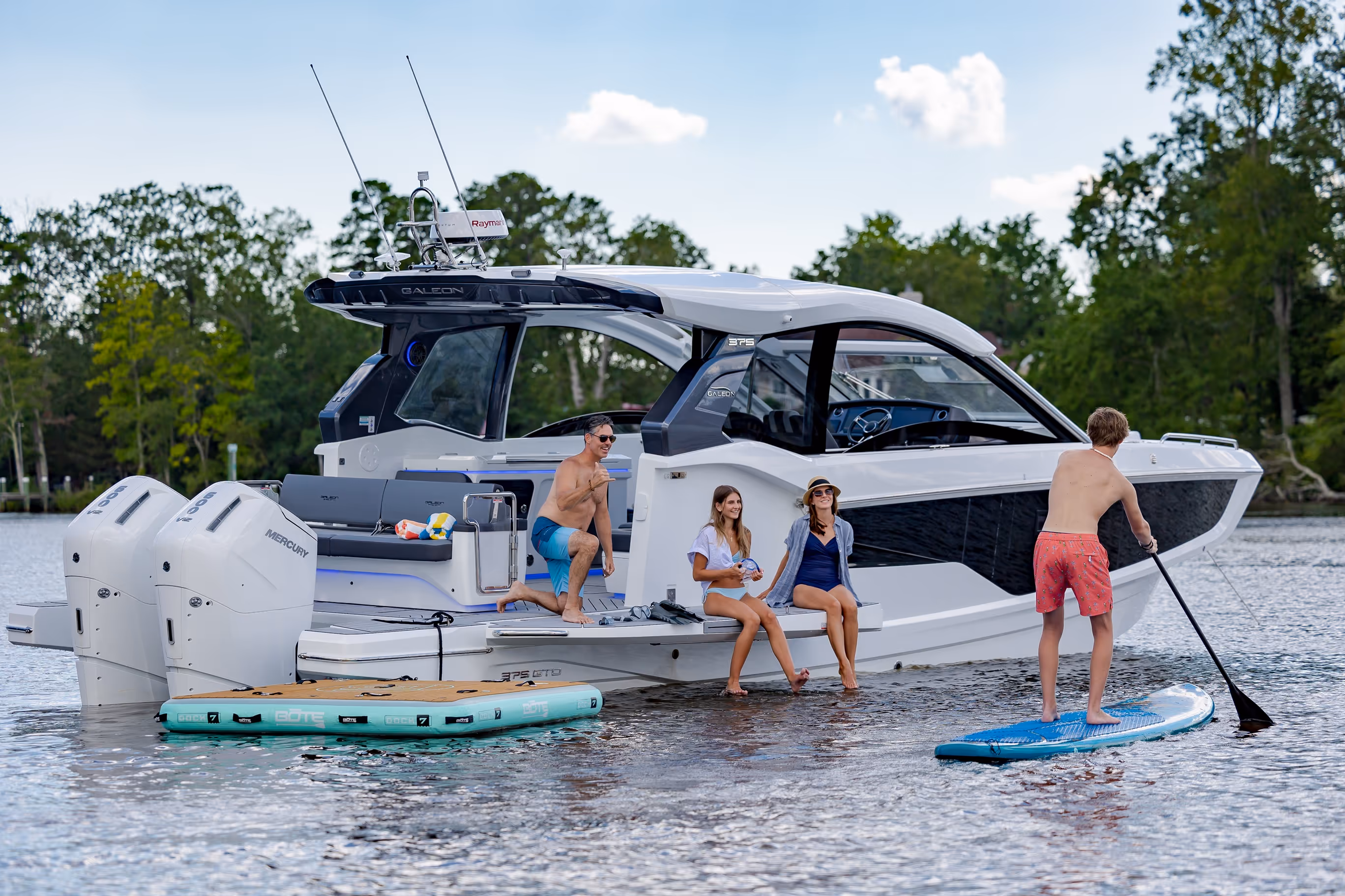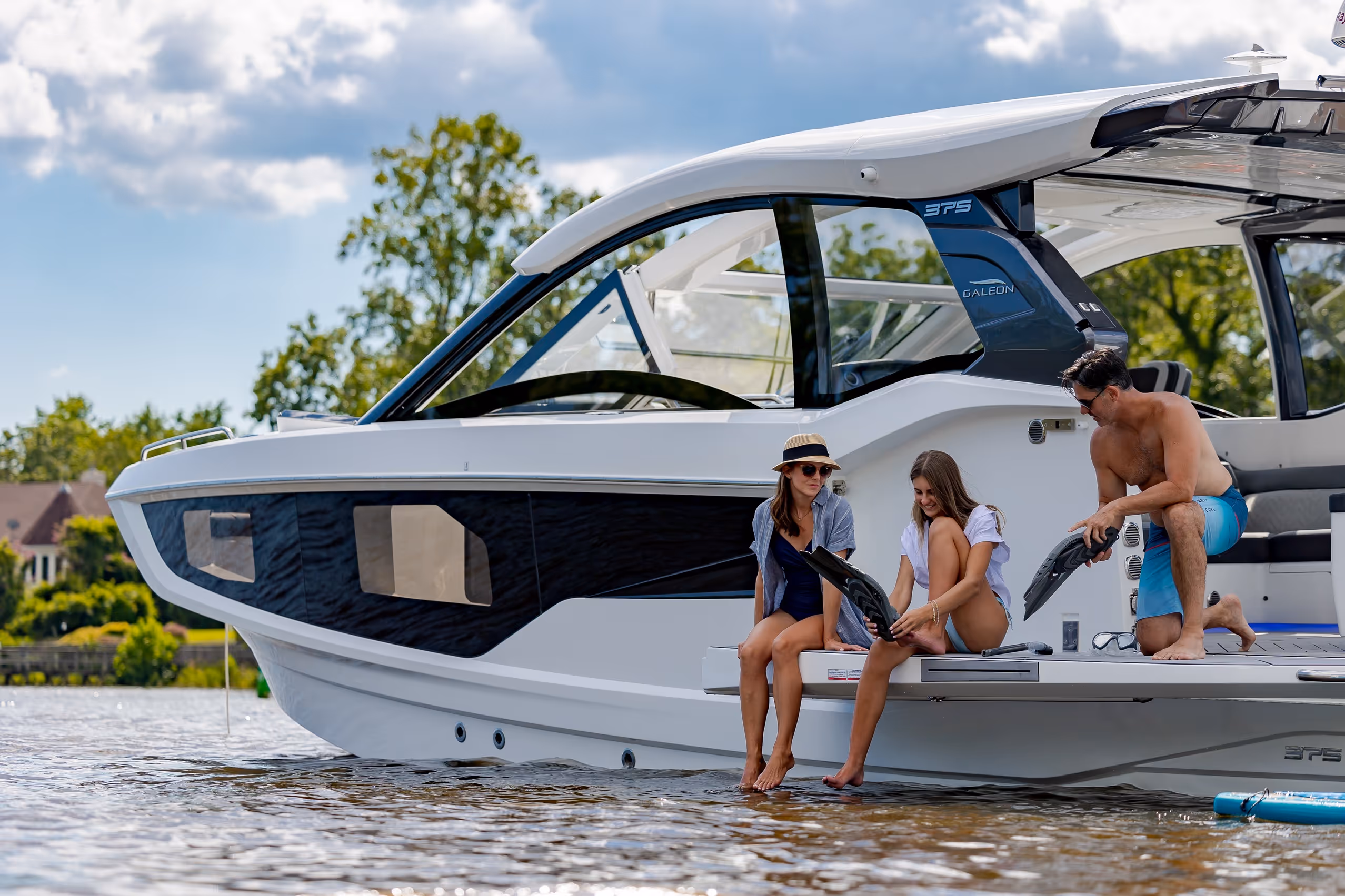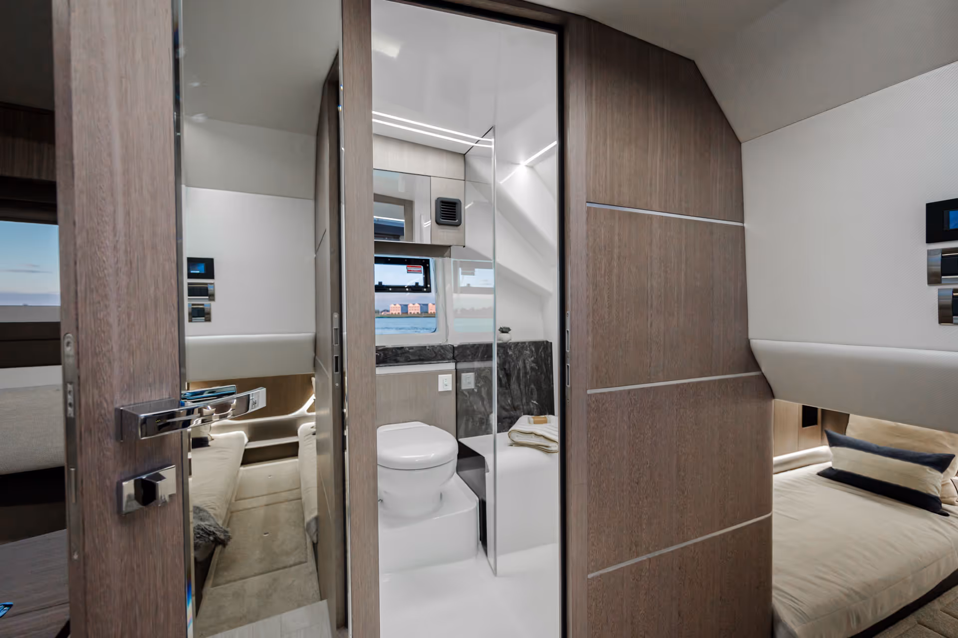 Das versenkbare Schiebedach über dem Steuerstand, die vollständig zu öffnenden Seitenfenster und das bündig umlaufende Deck bieten eine nahtlose Verbindung mit der Außenwelt. Am Bug verwandelt sich eine geräumige Lounge mit Nackenstütze in eine luxuriöse Sonnenliege. Im Cockpit sorgen ausklappbare Balkone, flexible Sitzgelegenheiten und mehrere Heckspiegeloptionen - Freizeit, Sitzbank oder Angelversion mit Lebendfässern und Rutenhaltern - für unübertroffene Vielseitigkeit und Komfort.