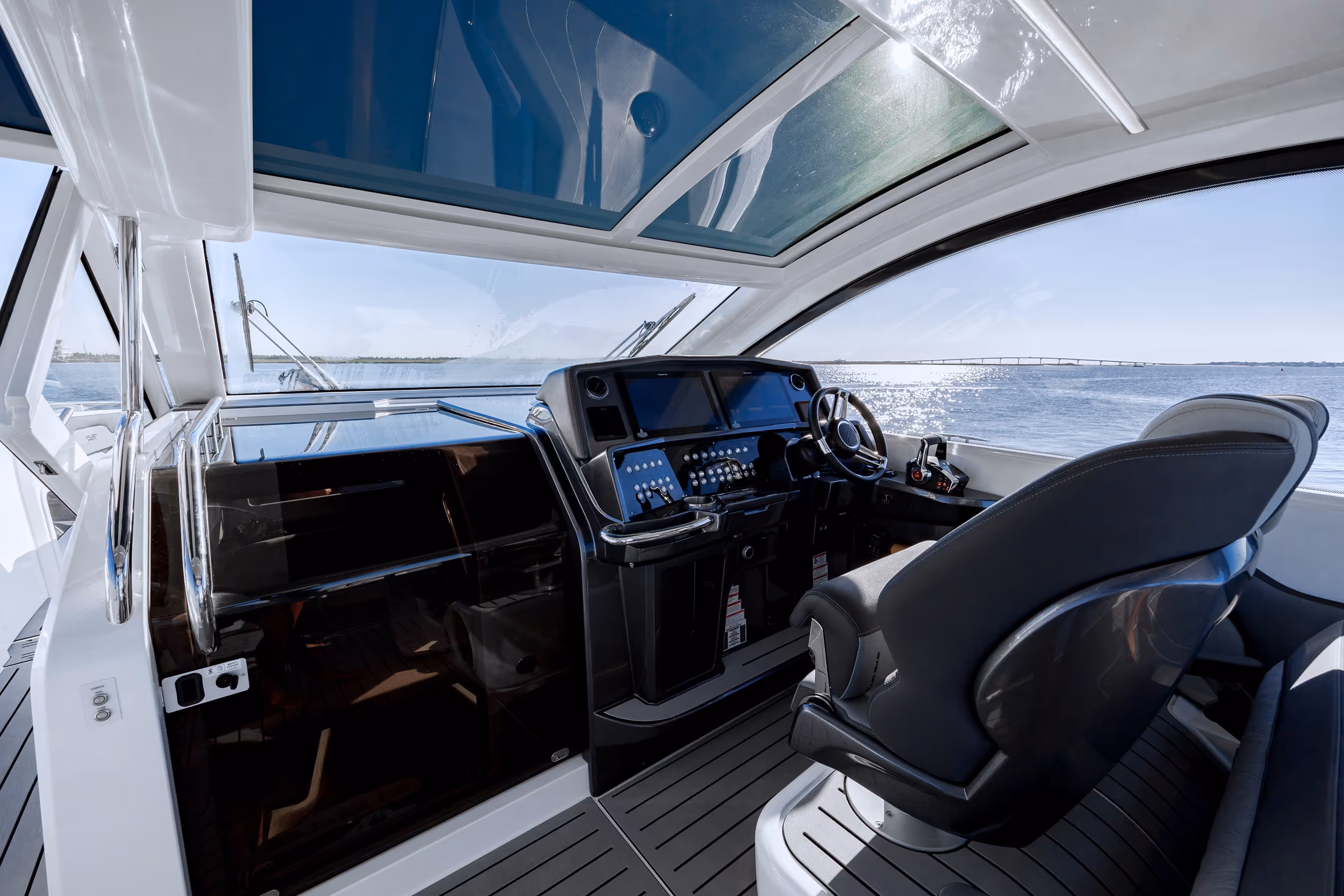Der kompakte und dennoch hochfunktionale Steuerstand verfügt über einen verstellbaren Kapitänssitz, ein Lenkrad und wichtige Instrumente wie GPS und Motorsteuerung. Alle Instrumente sind so positioniert, dass sie eine optimale Sicht bieten, um eine einfache Navigation und ein sicheres Manövrieren der Yacht zu gewährleisten.
