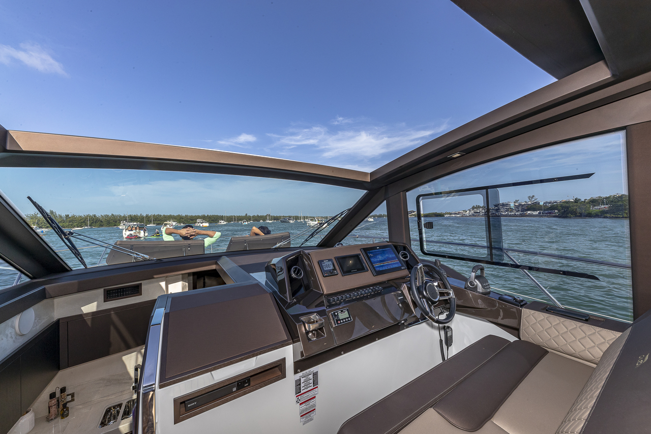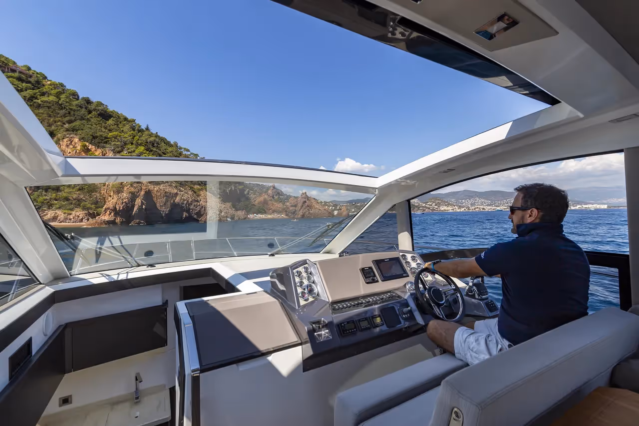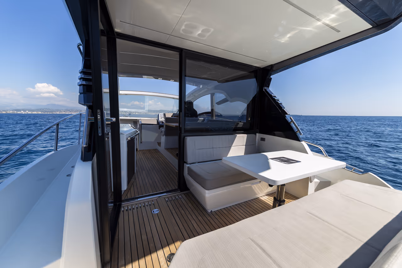 Die versenkbare Achterverglasung schafft eine geräumige, integrierte Verbindung zwischen dem Cockpit und dem Salon - perfekt für Unterhaltung und Entspannung auf See.