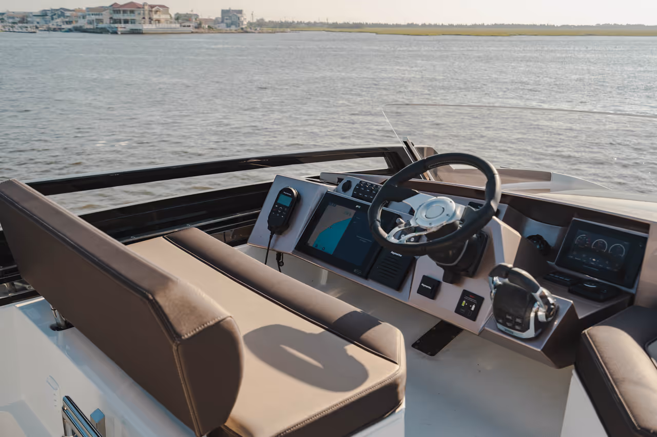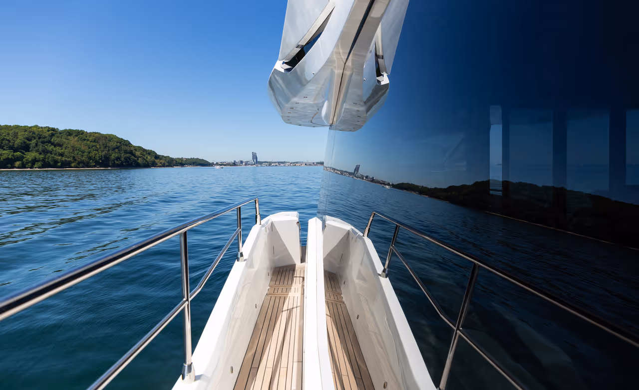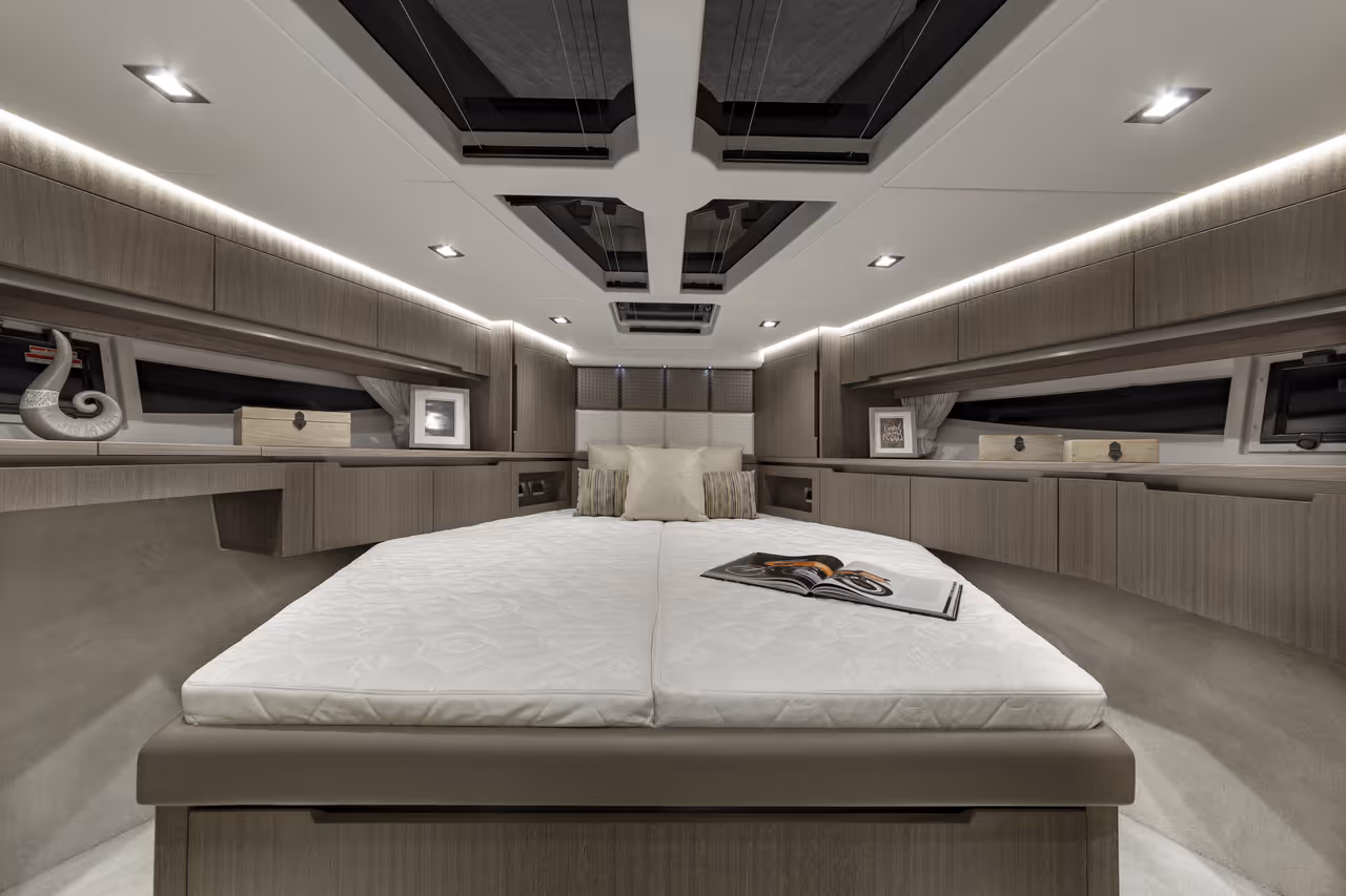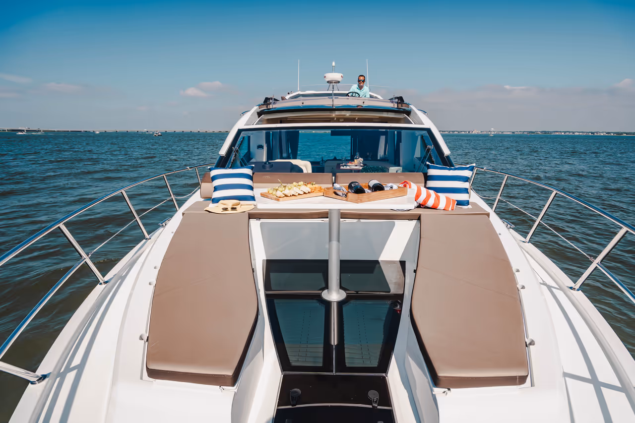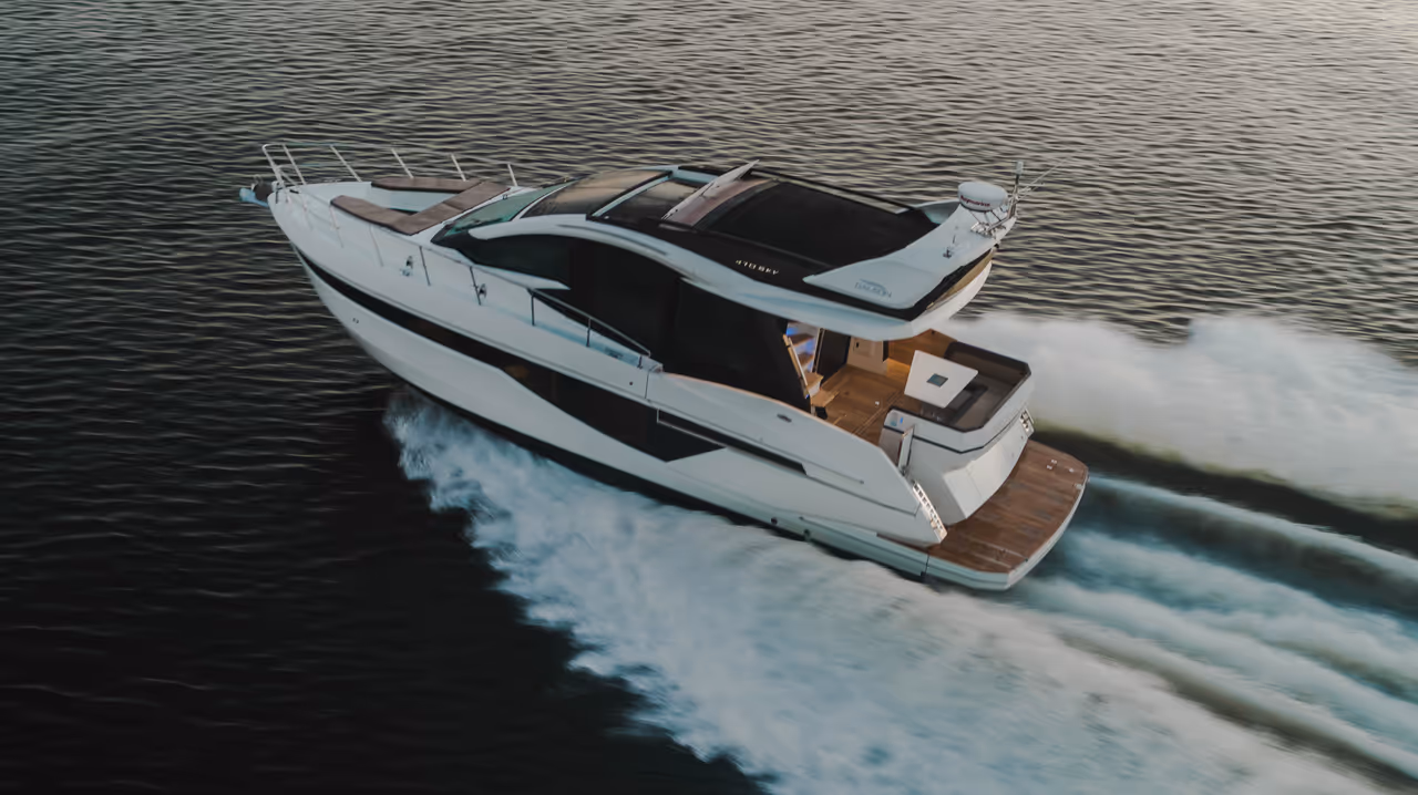 Genießen Sie die Vorteile einer Flybridge - zweiter Steuerstand, Lounge, Sonnenpolster - und behalten Sie dabei ein dynamisches, stromlinienförmiges Profil bei.