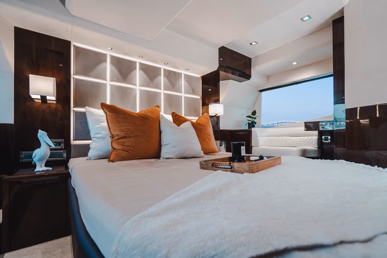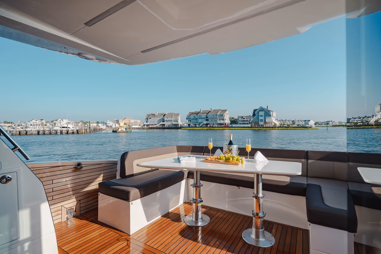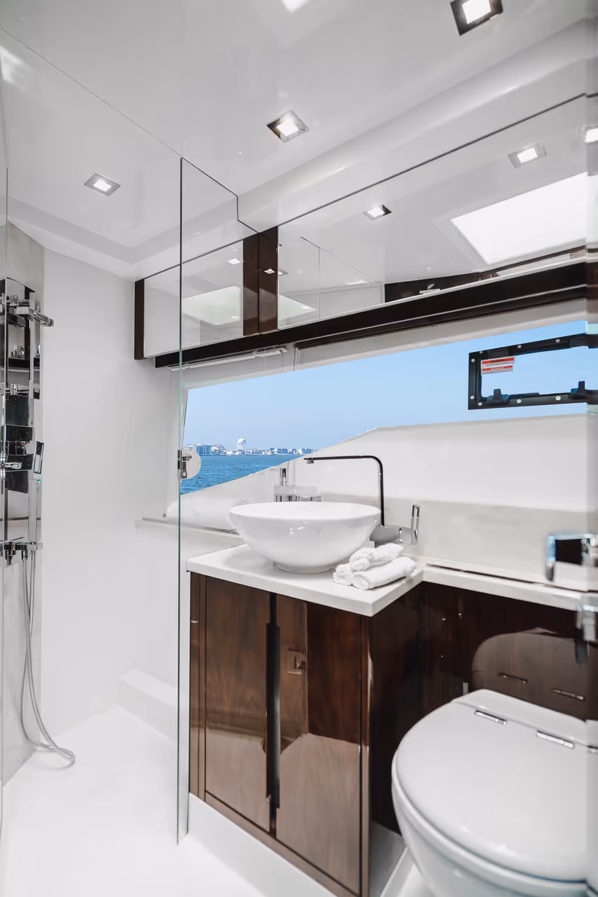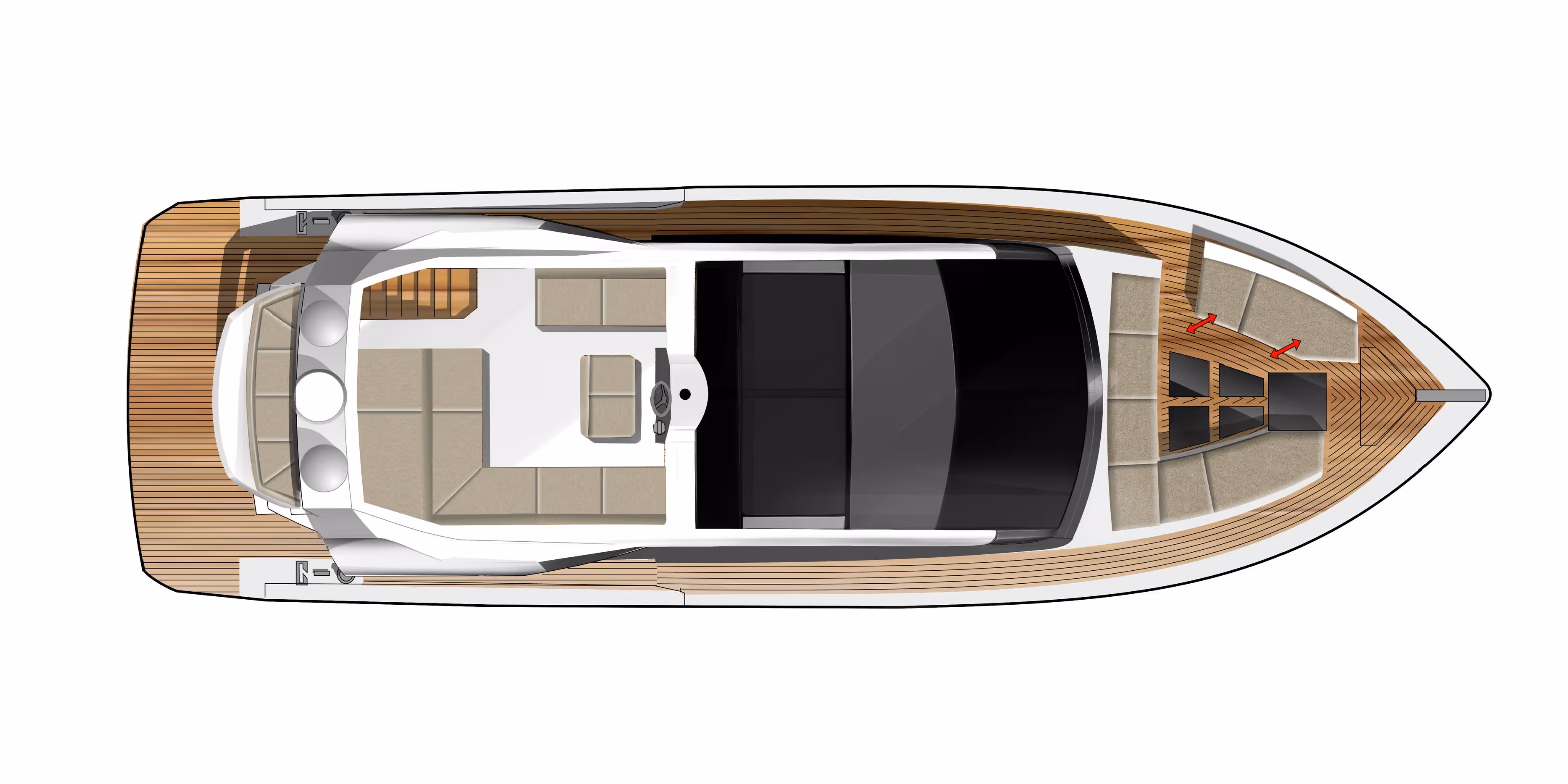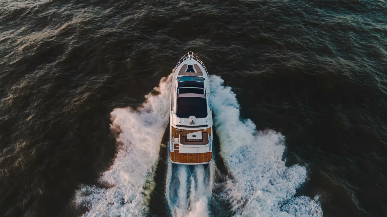 Genießen Sie die Vorteile einer Flybridge - zweiter Steuerstand, Lounge, Sonnenpolster - und behalten Sie dabei ein dynamisches, stromlinienförmiges Profil bei.