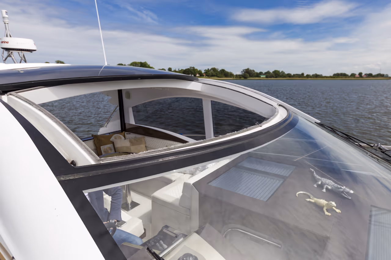 Große Schiebetüren verbinden den Salon nahtlos mit dem Cockpit, wodurch ein einheitlicher, offener Raum entsteht - perfekt zum Entspannen oder Unterhalten.