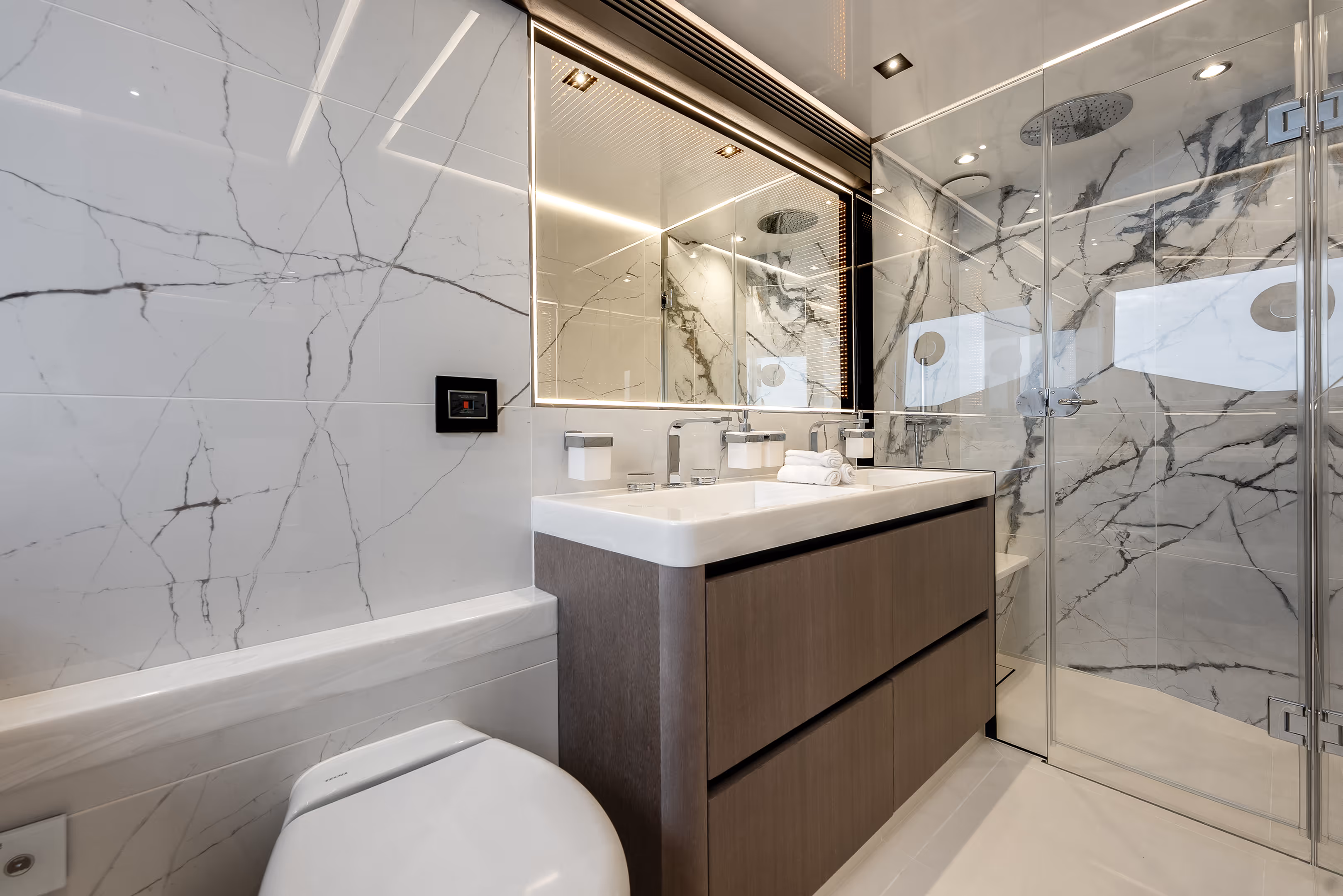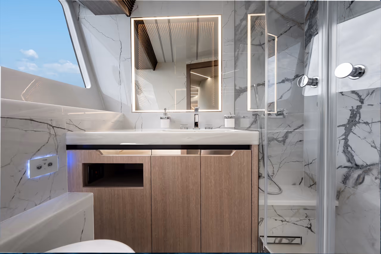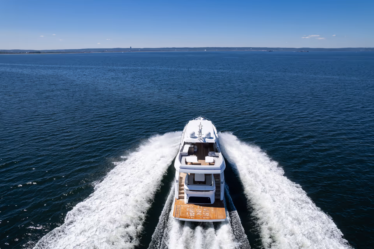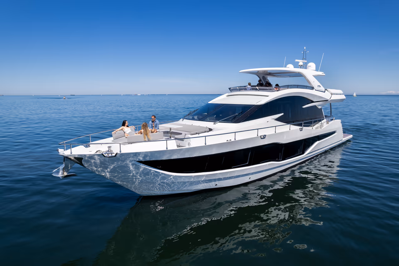 Von der weitläufigen Flybridge und den ausklappbaren Balkonen bis hin zur luxuriösen Lounge im Vorschiff und dem riesigen Cockpit bietet jedes Deck außergewöhnlichen Raum für Unterhaltung und Entspannung. Im Inneren beeindruckt die Yacht mit Panoramafenstern, edlen Materialien und einem Layout, das sowohl großartig als auch einladend wirkt.