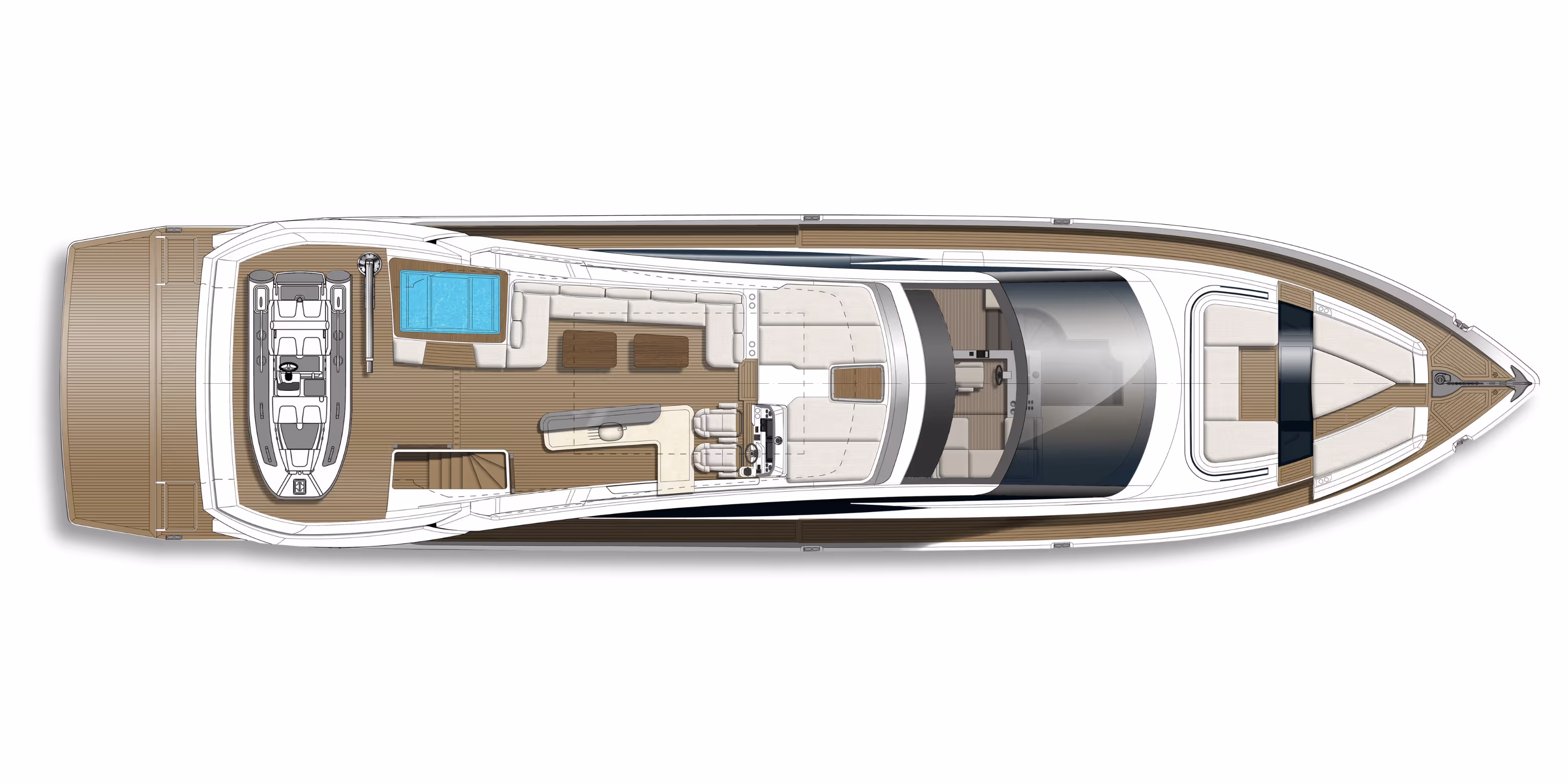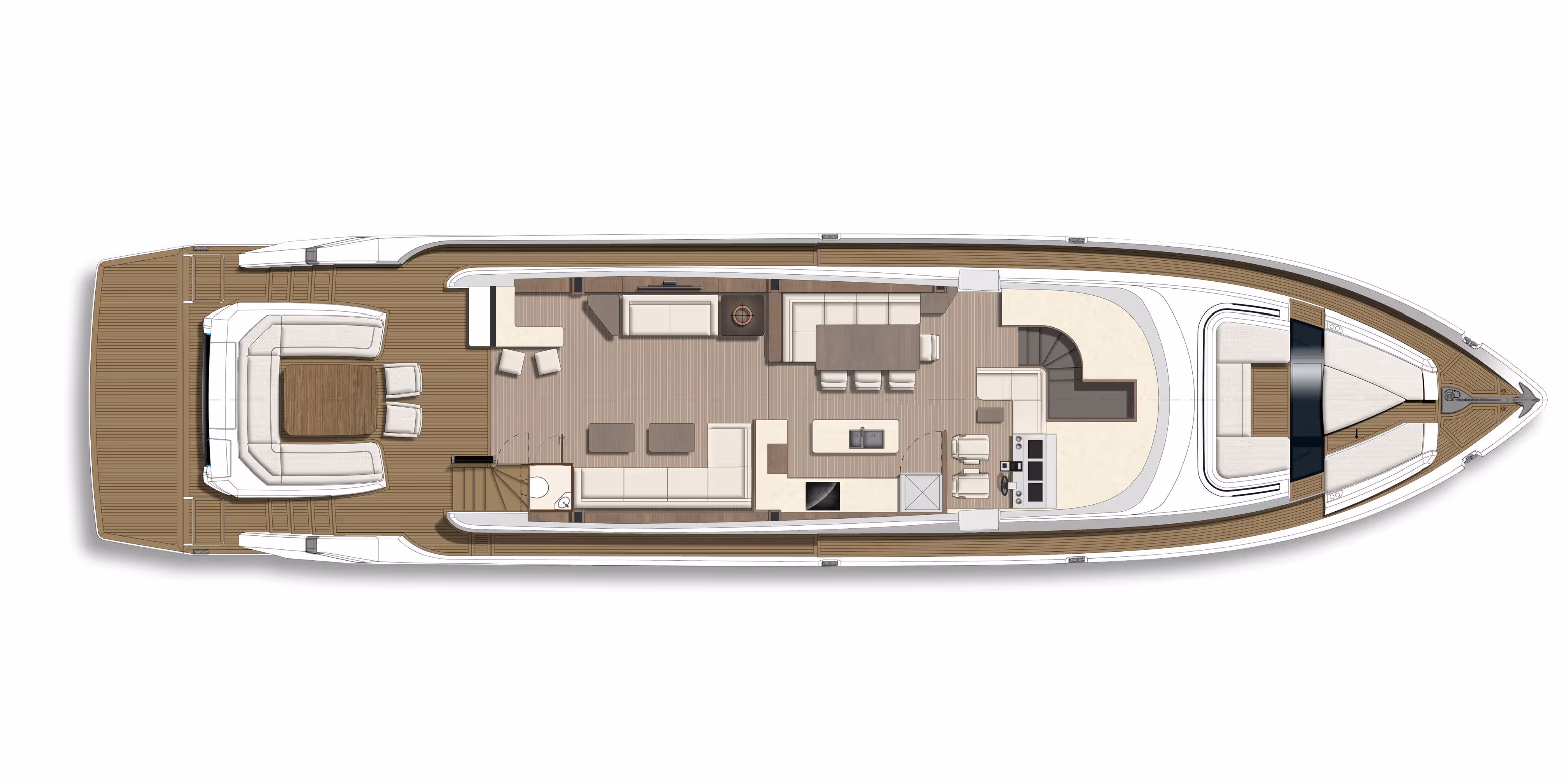 Von der Flybridge über das Vordeck bis hin zum achterlichen Cockpit ist jeder Bereich als spezieller Raum zum Entspannen, Essen und Kontakte knüpfen konzipiert - egal in welchem Moment.